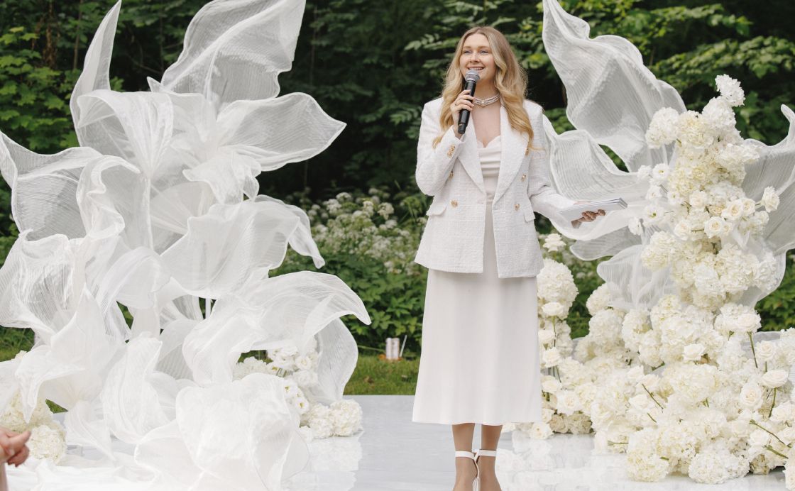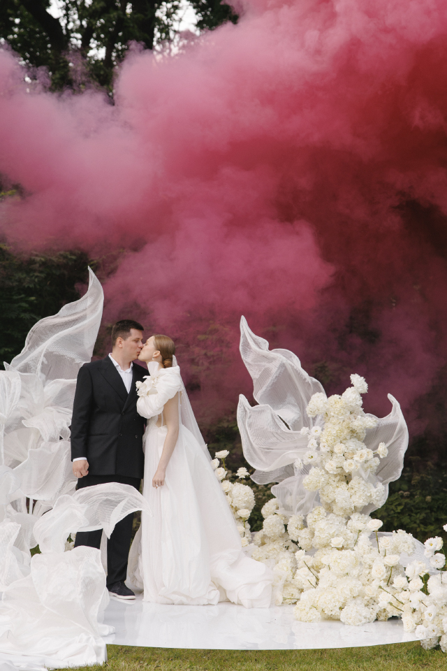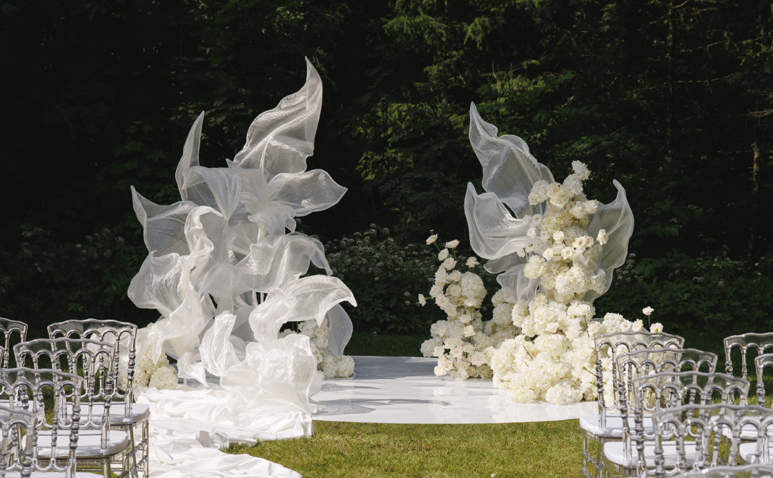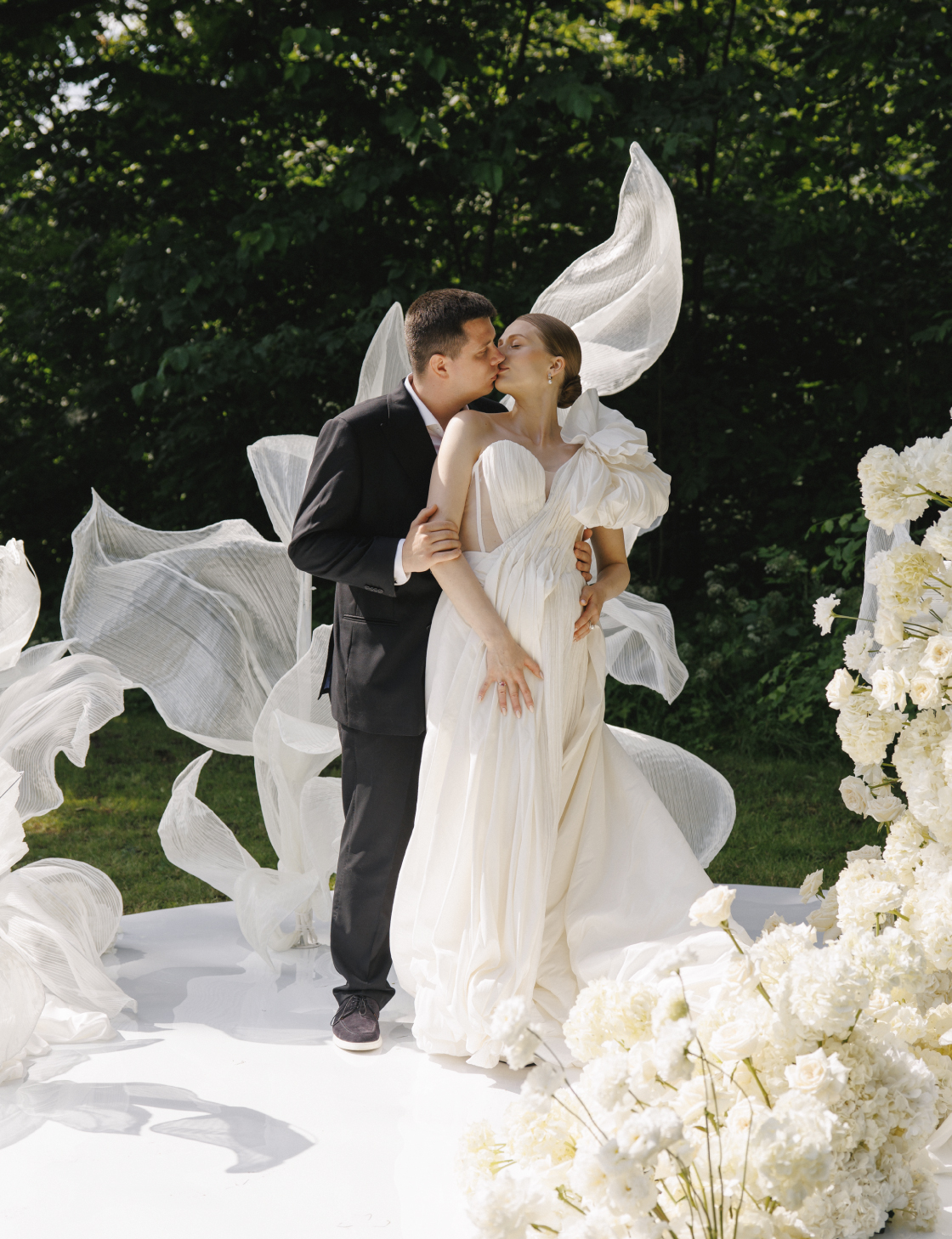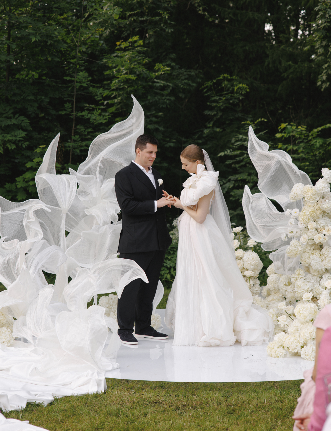 Арка для церемонии выглядела словно сотканной из воздуха — невесомые белые формы поднимались вверх, отражая символику лебединых крыльев. В их изгибах чувствовались лёгкость и чистота.