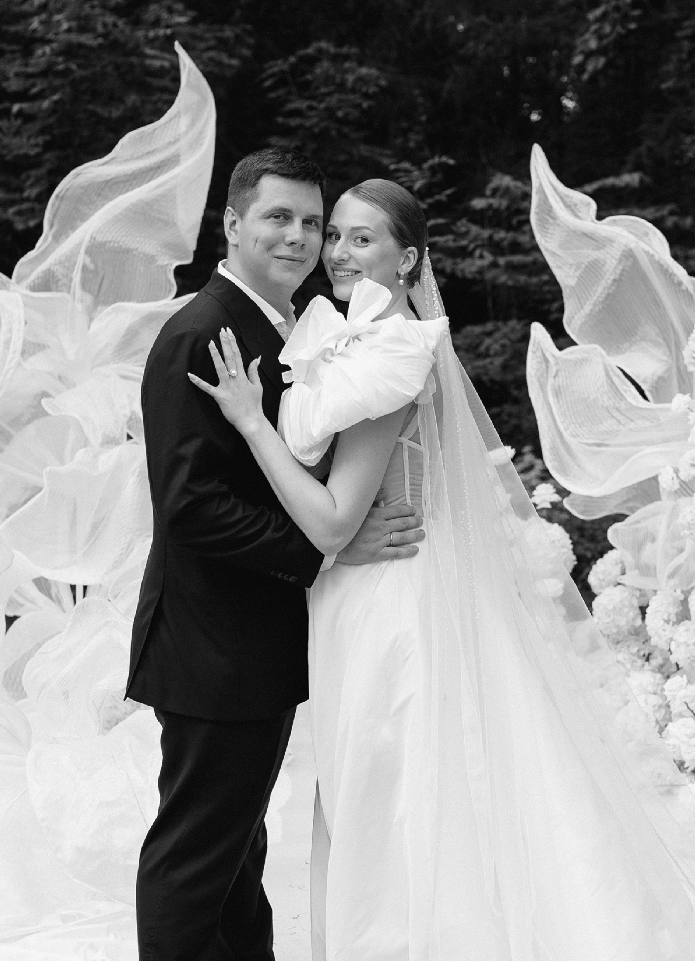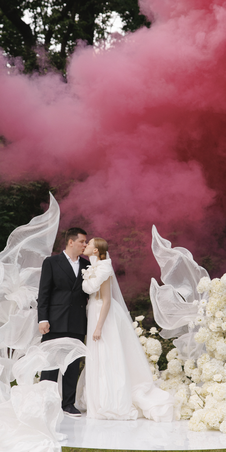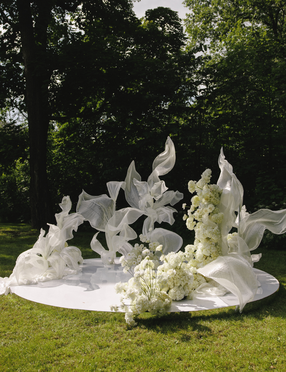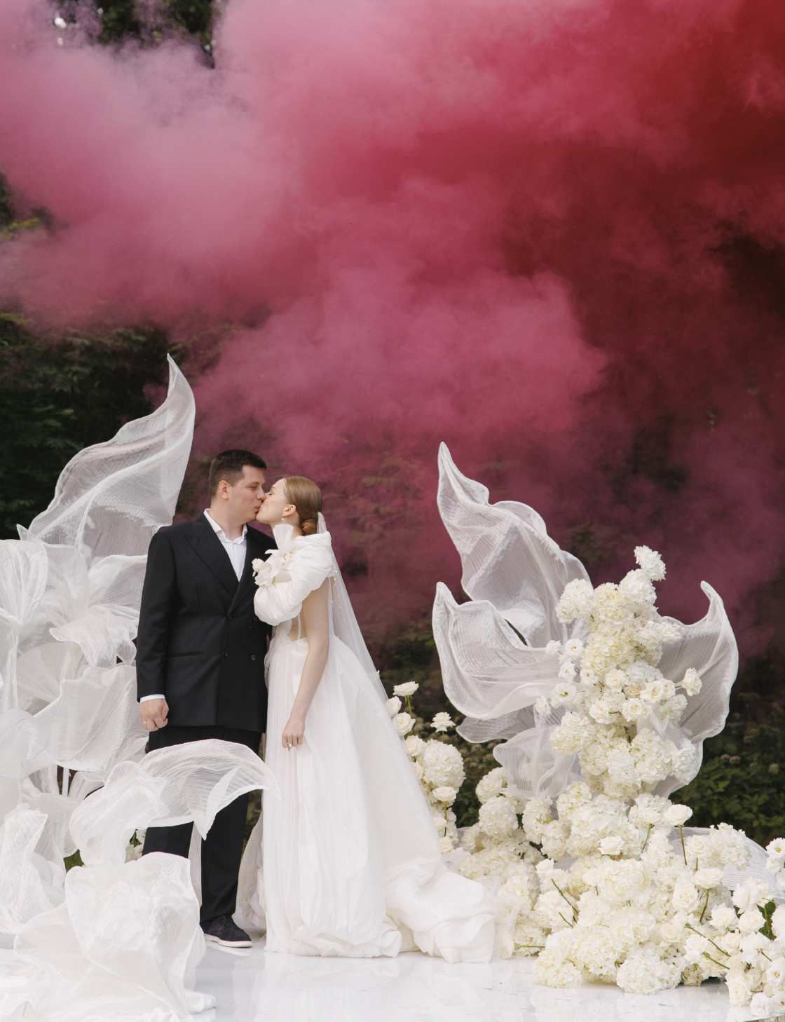 Арка для церемонии выглядела словно сотканной из воздуха — невесомые белые формы поднимались вверх, отражая символику лебединых крыльев. В их изгибах чувствовались лёгкость и чистота.