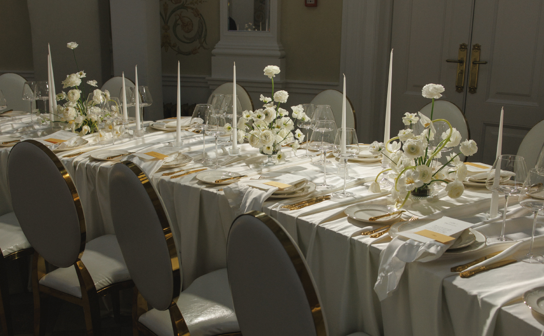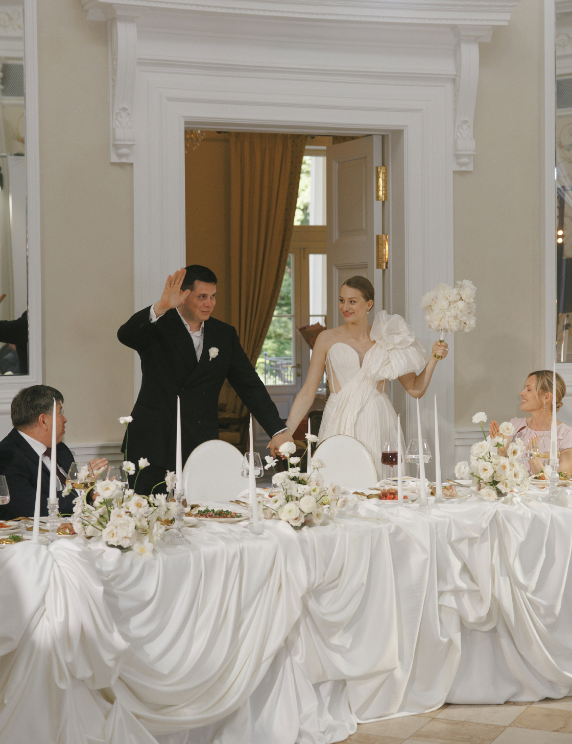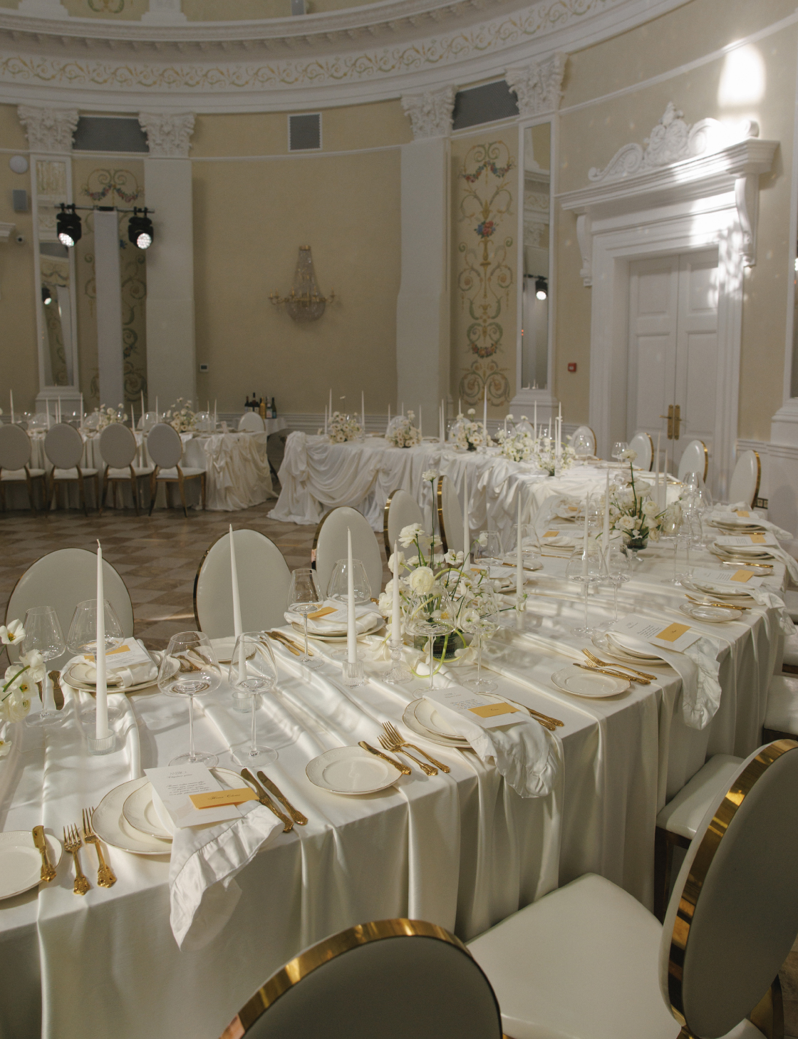 Для свадебного ужина Ирина и Алексей выбрали зал Ротонда, светлое и торжественное пространство. Здесь всё выглядело особенно гармонично: белоснежные скатерти, лаконичные цветочные композиции, стильные тонкие свечи.