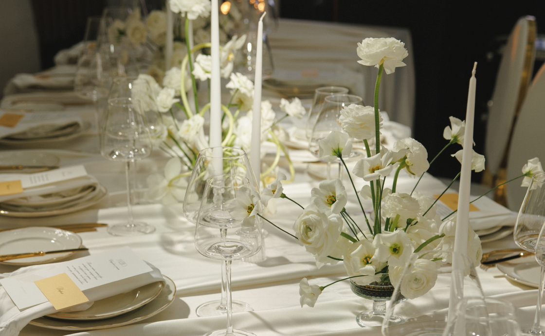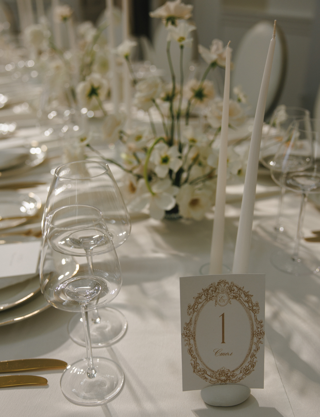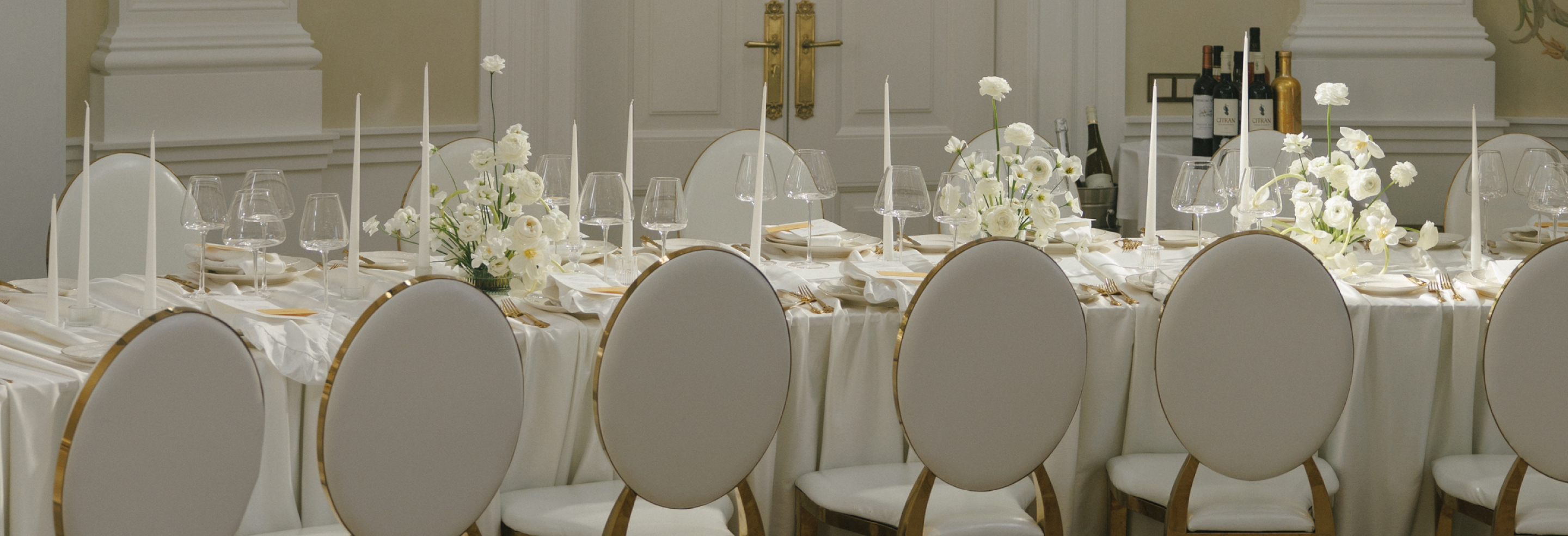 Для свадебного ужина Ирина и Алексей выбрали зал Ротонда, светлое и торжественное пространство. Здесь всё выглядело особенно гармонично: белоснежные скатерти, лаконичные цветочные композиции, стильные тонкие свечи.