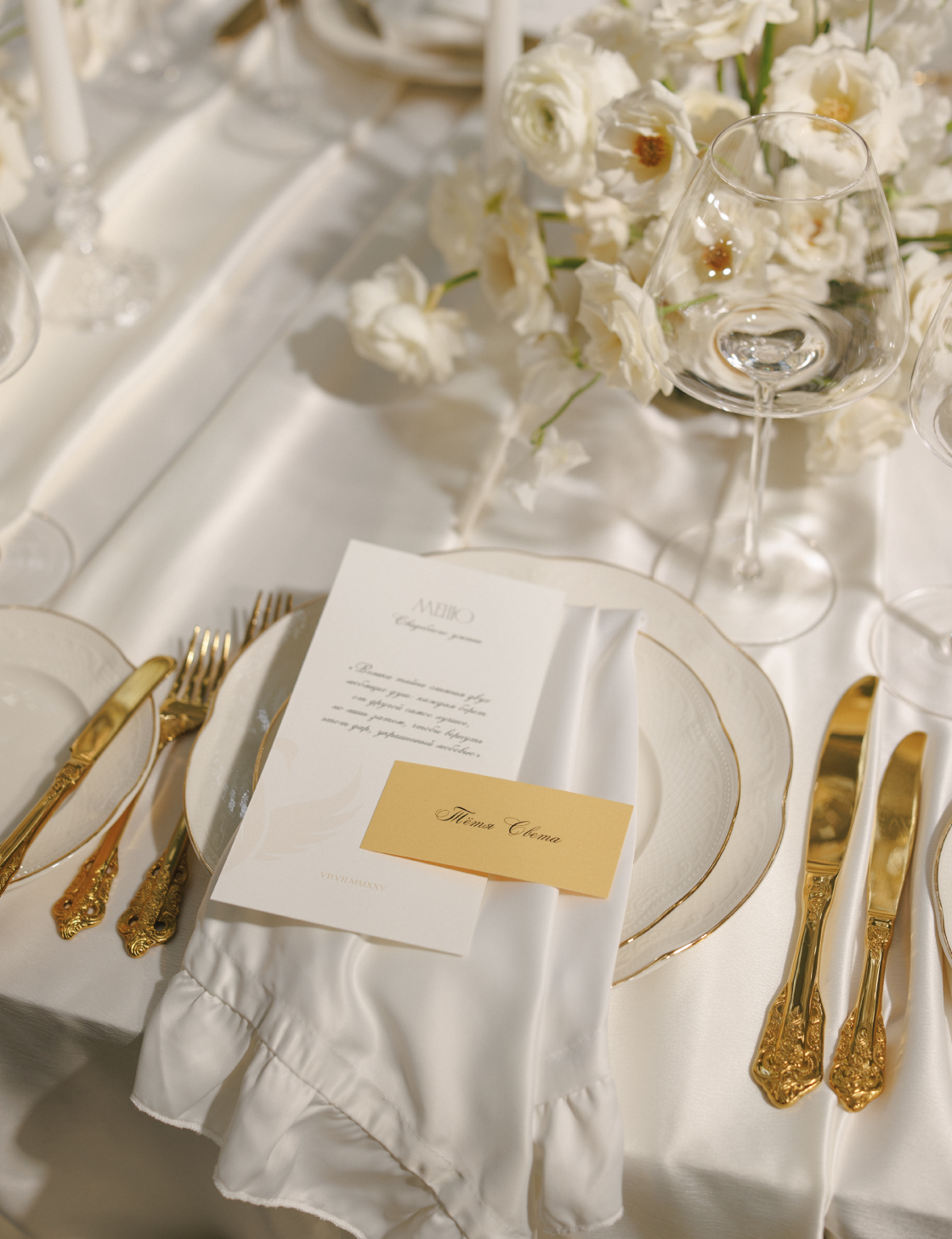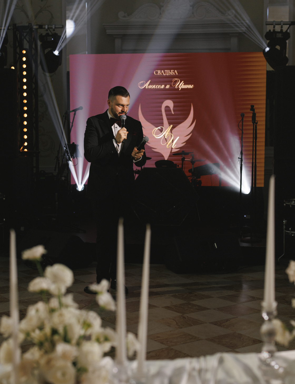 Идея свадьбы выросла из любви пары к искусству. Символом стали лебеди — олицетворение верности и нежности. В концепции чувствовалась и театральная линия: афиша, декорации, сцена, где всё происходит торжественно и эстетично.