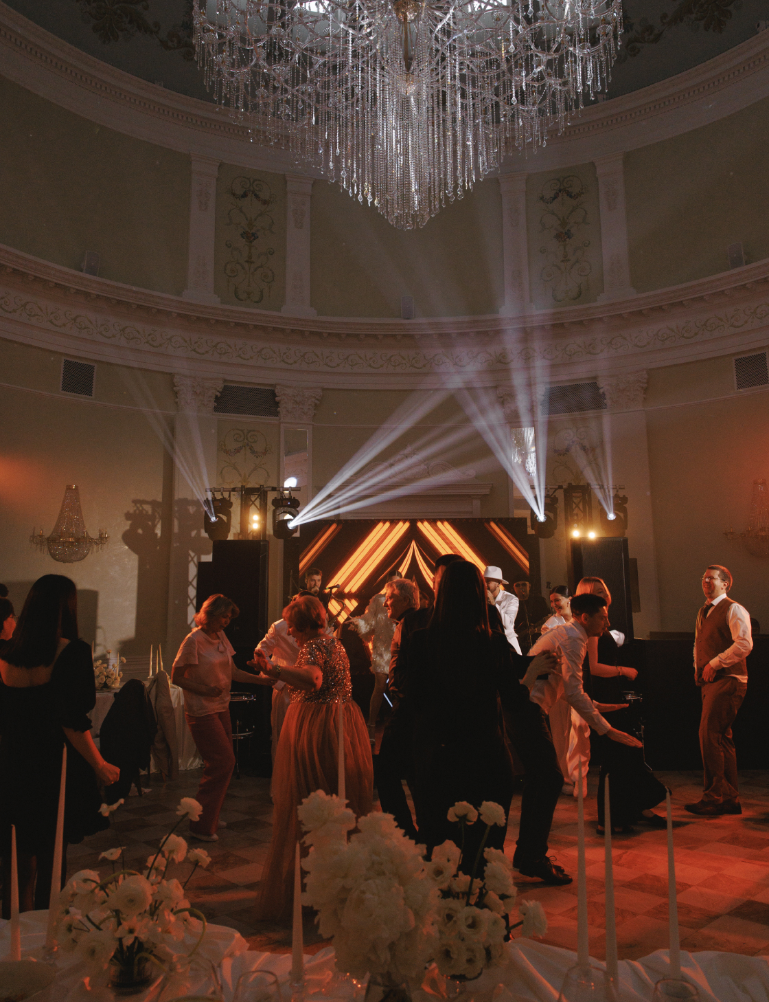 Первый танец молодожёнов стал естественным продолжением вечера. Ребята танцевали без постановки, под живое исполнение кавер-группы. Через мгновение к ним присоединились гости, и зал наполнился движением и счастливыми улыбками.