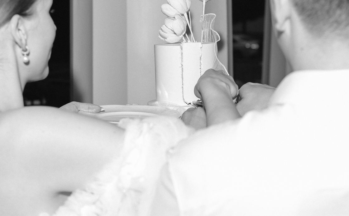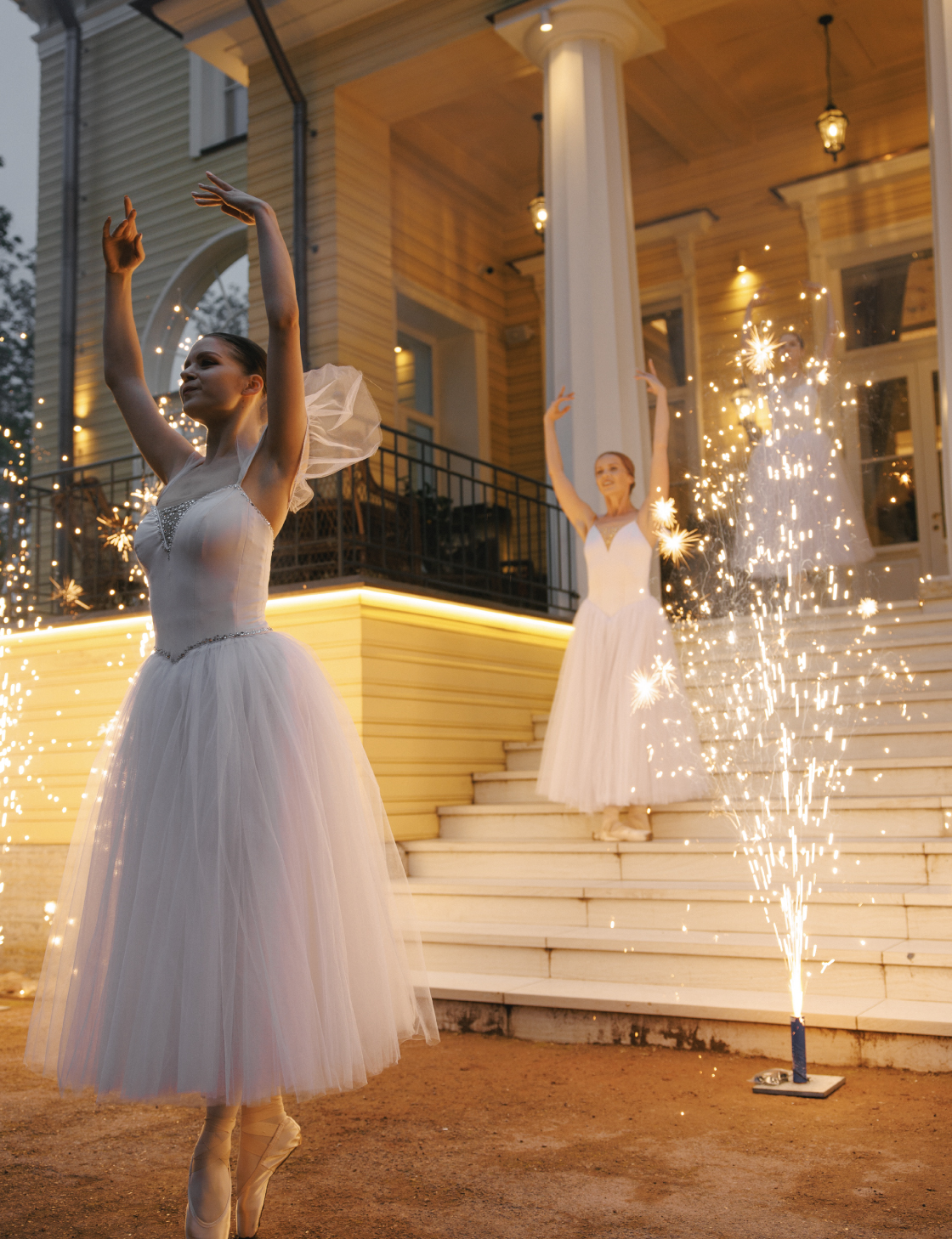 С наступлением вечера гости вновь были приглашены в сад, где под великие ноты Иоганна Штрауса на ступенях виллы появились балерины и исполнили изящный, воздушный танец. Их движения будто продолжали лейтмотив красоты и вдохновения этого дня. Когда танец подошёл к концу, на террасу подали свадебный торт. Ирина и Алексей вместе сделали первый надрез и угостили друг друга десертом.