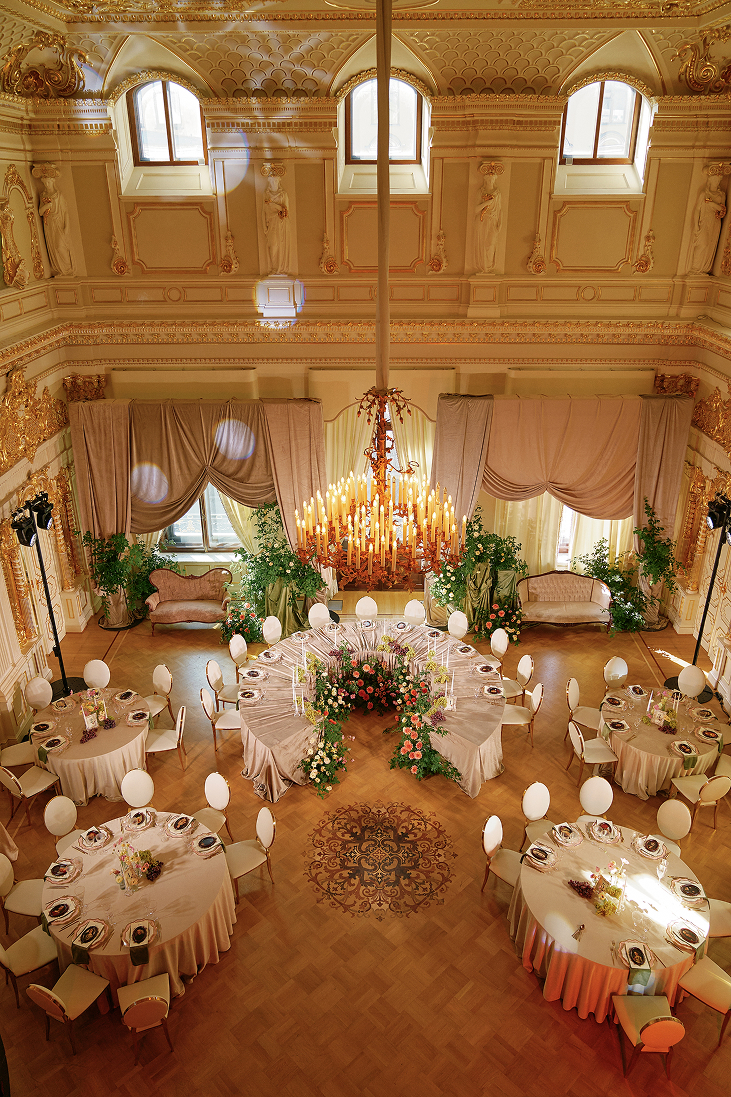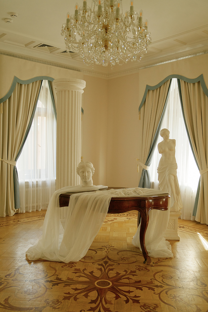 В особняке два этажа, сад и двор площадью 980 м² — пространство, где каждая пара может создать собственный сценарий праздника. На втором этаже расположены зимний сад, лекторий, библиотека, музыкальная комната и концертный зал на 60 гостей — идеальное место для церемонии и банкетного ужина. Интерьеры особняка впечатляют: белые стены, золоченая лепнина, старинная роспись потолков и бронзовые люстры. Каждый зал будто создан для свадебной фотосессии, наполненной светом, блеском и утонченной роскошью. Снимки здесь похожи на кадры из фильма, где главные герои — вы.
